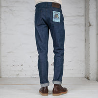 Der Fabric: 14.5 oz japanischer Selvedge Denim, gewebt mit niedriger Spannung und unregelmäßigen Slub-Garnen. Das sorgt für eine raue, ungleichmäßige Struktur. Die Garne sind im Rope-Dye-Verfahren mit Indigo gefärbt, wobei die ungleichmäßige Garnstruktur das Indigo unterschiedlich stark aufnimmt. Mit der Zeit entstehen dadurch markante Kontraste und ein lebendiger, dreidimensionaler Fade.