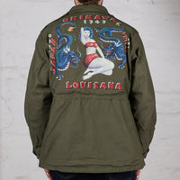 Auf dieser Jacke findet sich eine handgemalte Frauengestalt, so schön und kraftvoll, dass selbst ein Drache ihr unterliegt. Vielleicht die Erinnerung an eine Geliebte, vielleicht die Projektion einer unerreichbaren Muse.