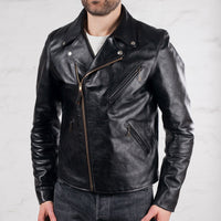 The "Deviant" horsehide jacket by DOUBLE HELIX is inspired by vintage motorcycle jackets. Authentic details like the asymmetric closure and quilted lining have been reimagined in a contemporary cut.