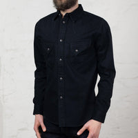 Das in Japan hergestellte "2220 8oz Stretch Denim Western Shirt" von Pure Blue Japan besteht aus 8oz Black Denim mit minimalem Stretch für Bewegungsfreiheit.