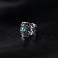 "Crossed Arrow Cigar Band Ring" aus massivem Sterling Silber mit leuchtendem Turquoise und handgestempeltem, Native American inspiriertem Design.