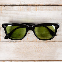 Die "MA24002 Geyser Sonnenbrille" von The Real McCoy's basiert auf dem Modell, das Präsident John F. Kennedy trug. Ein beliebtes amerikanisches Design der 1950er und 1960er Jahre mit schwarzem oder schildpattfarbenem Zelluloidrahmen und getönten Gläsern.