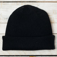 Die schwarze "BR02272 A-4 Knit Cap" ist von den Strickmützen inspiriert, die die Mechaniker der Armee und der Luftwaffe während des Zweiten Weltkriegs trugen, und ist Teil der Kollektion Buzz Rickson's x William Gibson.